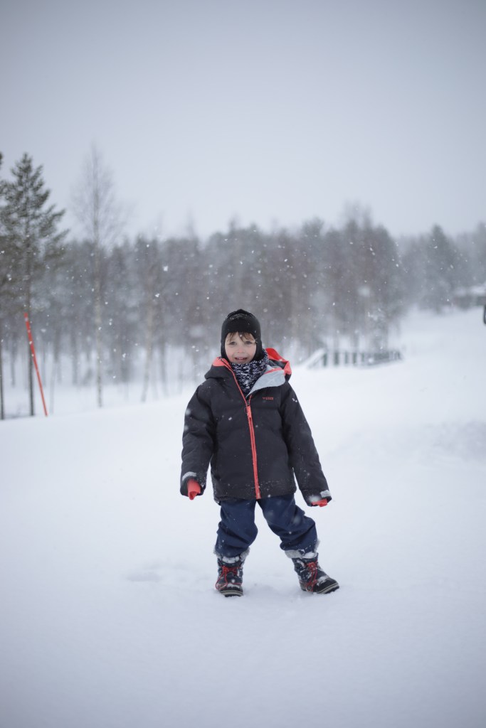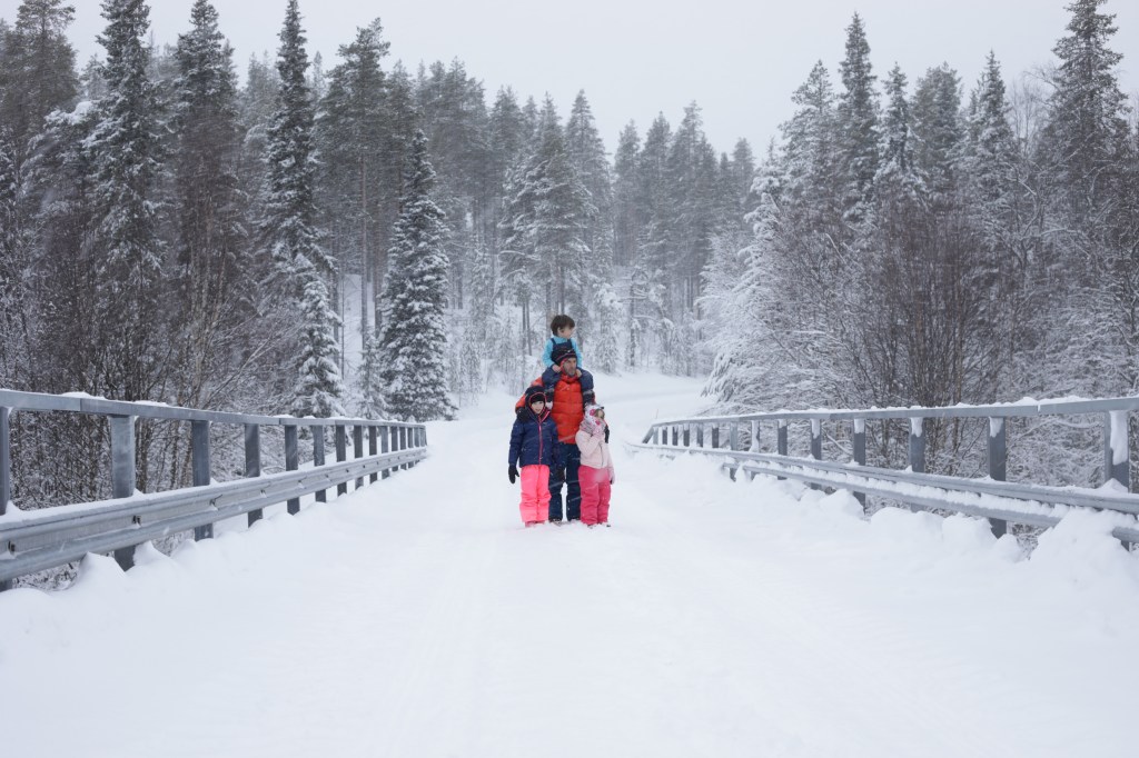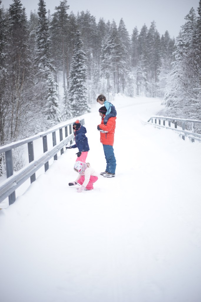 Nous irons à la recherche d’un pont, à quelques km, où Élodie pourra faire des photos avec le lac semi gelé car il y a du courant. Les enfants s’amusent dans la poudreuse.